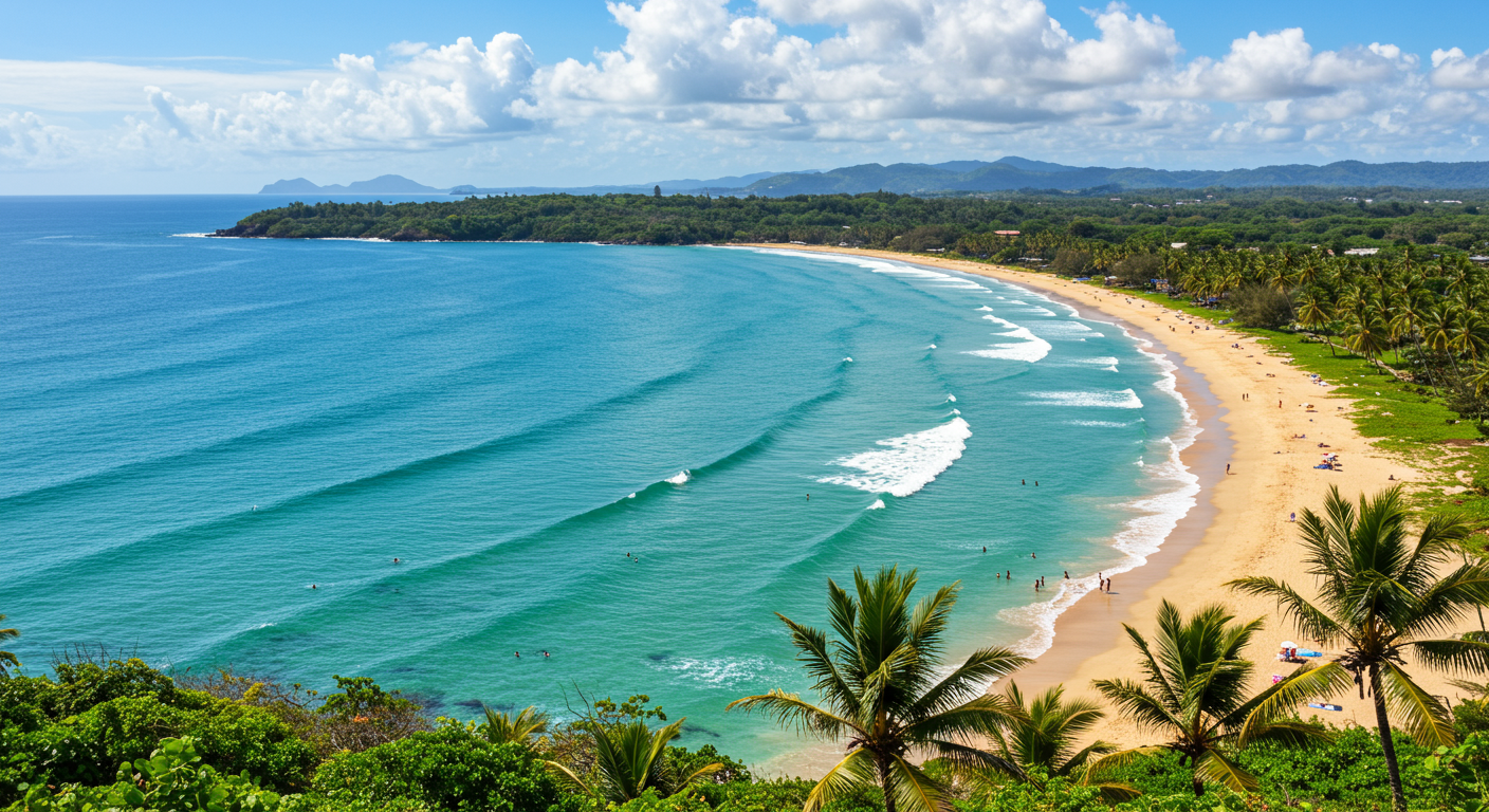 Waipouli Beach, a quiet spot that’s popular for sunset strolls. The Waipouli Beach Resort sits along the south end with shopping, dining, and hiking spots within walking distance from the shore.